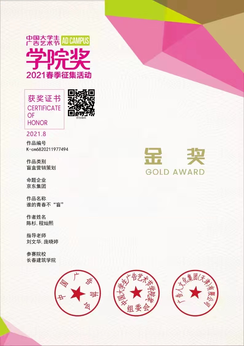 8月22日,中国大学生广告艺术节学院奖2021春季创意盛典以线上直播的形式隆重举行,此次颁奖典礼云集众多中国知名品牌代表和行业大咖,来自全国各高校的师生们齐聚现场,共襄盛举。我院文化产业管理专业学生完成的参赛作品《谁的青春不迷‘盲’》最终在企业营销策划类别比赛赛道众多件作品的激烈角逐中,脱颖而出,勇夺奖营销策划类金奖。