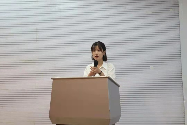 接着,视觉传达专业大四贾宇欣同学作为学生代表发言。她首先给21级视觉专业新生播放了一段专业介绍视频,随后向同学们讲述了她对视觉传达专业的理解和这几年参加的各种大小的比赛中的作品,最后她希望新生们能愉快度过愉快的大学时光,不辜负期望,不虚掷光阴,最终成为那个更好的自己。